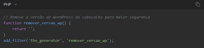 Por padrão, o WordPress adiciona uma meta tag no cabeçalho do seu site informando a versão que você está utilizando. Isso pode ser um risco de segurança, pois hackers podem usar essa informação para explorar vulnerabilidades conhecidas em versões mais antigas. Em vez de instalar um plugin de segurança pesado apenas para isso, você pode usar um simples filtro no seu functions.php: