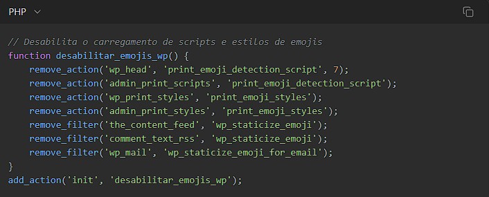 Este snippet utiliza a função remove_action (o oposto de add_action) para desenganchar os scripts de emoji do processo de inicialização do WordPress, resultando em um carregamento de página mais rápido.