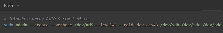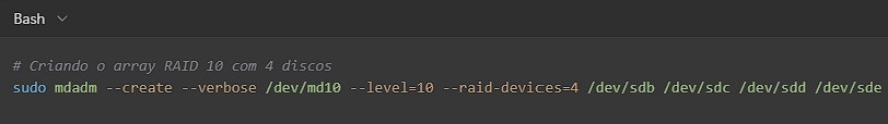 Vamos aos exemplos reais. Imagine que você tem discos identificados como /dev/sdb, /dev/sdc, /dev/sdd e /dev/sde.