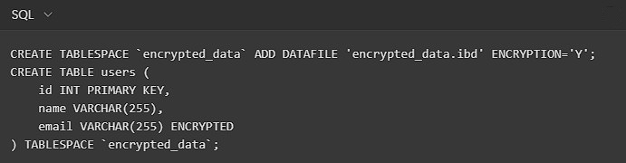 Para um projeto que lida com dados sensíveis de usuários, a criptografia de dados em repouso é crucial. No MariaDB, você pode facilmente configurar a criptografia para um tablespace específico: